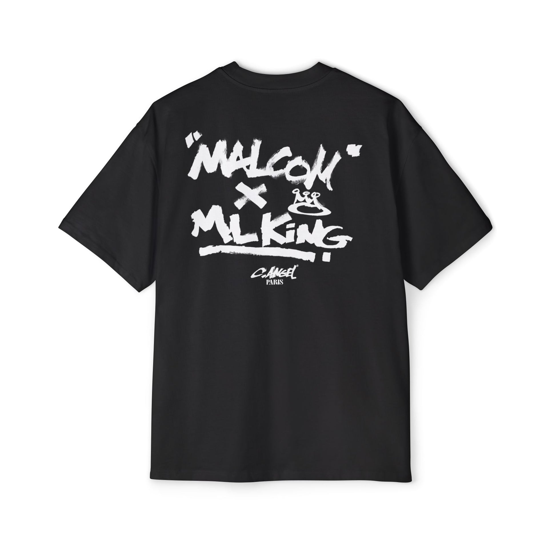 Ce T-shirt rend hommage à l’un des clichés les plus symboliques de l’histoire noire : la poignée de main entre Martin Luther King et Malcolm X.